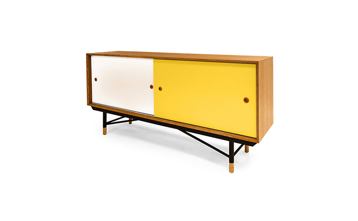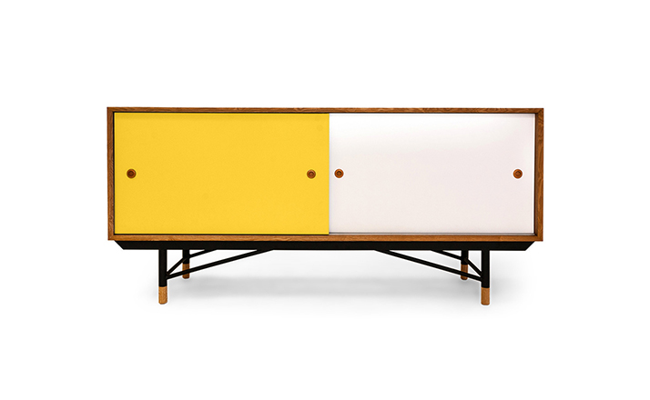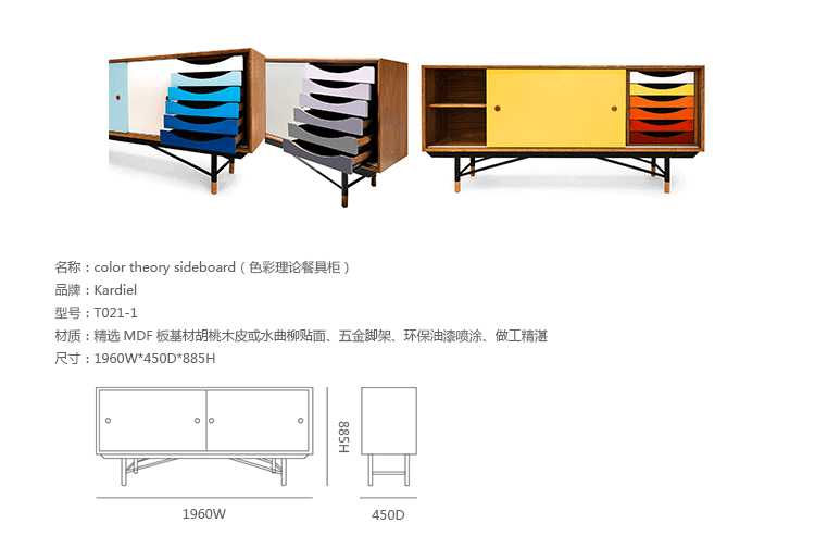 color theory sideboard(色彩理论餐边柜)是设计师Juhl Finn设计的,Kardiel公司制作的经典实木家具,1940年,他设计的第一张座椅、也是最经典的作品——《鹈鹕椅》(Pelican Chair),目前为纽约现代艺术博物馆 MOMA 所珍藏。彩色的滑动门与托盘餐具柜是1955年由Juhl Finn为BOVIRKE设计的。)是Kardiel公司制作的经典实木家具。复古但永不过时的木炭是和橙色,结合美国核桃开创了20中世纪六十年代中现代主义的时代。在现代主义的存储家具上, Finn Juhl和 Arne Vodder 最先尝试胶木和天然木的组合运用。这是大胆的创新,他们结合传统的新鲜的新兴技术与现代主义的概念。他们通过这些色彩绚烂的产品所实现的是令人印象深刻的比例的平衡。制作采用精选MDF板基材胡桃木皮或水曲柳贴面、五金脚架、环保油漆喷涂、做工精湛。颜色元素的使用反映了他迷恋歌德的著名彩色圈,颜色处于和谐的凝聚力。