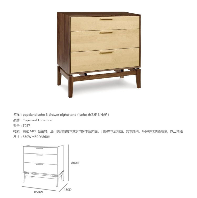 copeland soho 3 drawer nightstand(科普兰soho 3抽床头柜)是Copeland Furniture公司copeland实木系列之一。我们塑造环境,然后环境塑造我们,copeland旨在传递的舒适度和清晰度的感情。设计借用了一些最优秀的传统和当代的设计要素,非常具有特色。这个中世纪现代风格的设计,提供了3层平滑抽屉存储空间,可以使您更好的归纳自己的物品,提供大量存储空间。制作采用精选MDF板基材、进口美洲胡桃木,贴面、实木脚架、彩色装饰边、环保净味油漆喷涂、做工精湛。