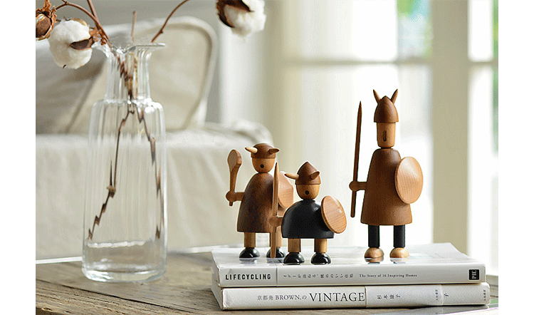 由于50年代的丹麦活跃着一股「斯堪地那维亚现代主义设计」风潮,延续低调简洁的风格并大量采用自然木材与传统工艺所迸出的美丽火花,设计大师Jacob Jensen也致力其中成为见证历史的大师之一。Jacob Jensen Wooden Viking(维京海盗)是经典的北欧形象,随着《加勒比海盗》系列电影的风靡,维京海盗在骁勇彪悍的传统形象里增加了俏皮、温暖、幽默的一面。这一组维京海盗形象为主题的北欧木雕设计,正是基于如此可爱的解读而做,摆在桌面上形成了饶有趣味的场景感,也是用来赠送的高档礼品。