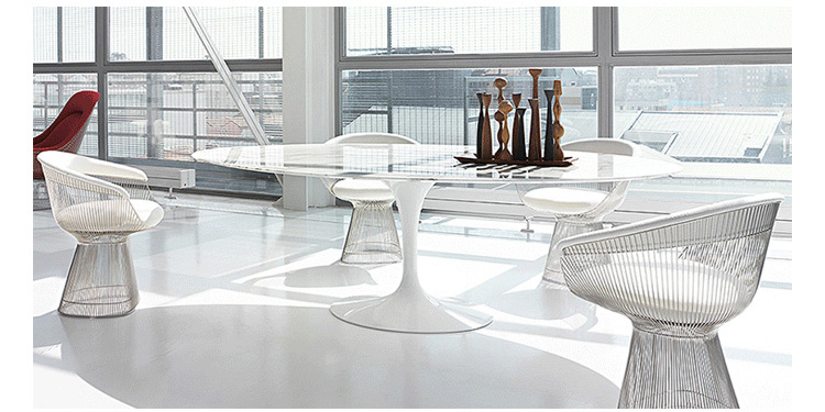 1966年榮獲 American Institute of Architects International Award 美國建築協會國際大獎的 Platner Chair,在設計師 Warren Platner 的創意下,將鋼絲雕塑轉化成一系列收藏級的傢俱,創造了現在被認為是當今時代的設計圖標。