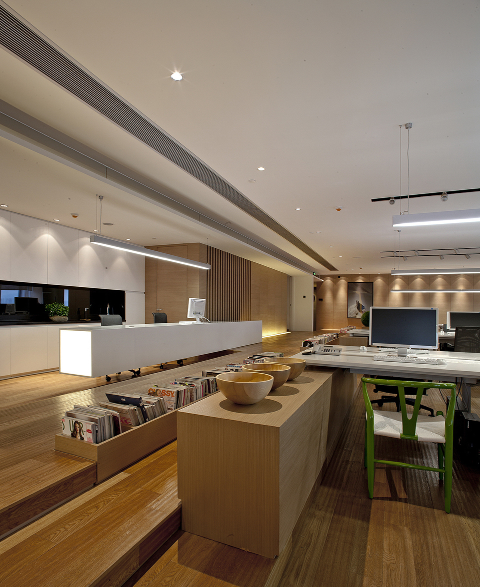 无论是下沉式设计部,开放式茶水间或者储书方式,灯光,家具,都是在构建聚落式场景,减少对着电脑呆滞的时间,能更随性的阅读书籍,调试衣物板式,选择物料,同时交流,分享设计。良性的工作环境,良性的竞赛及分享意识。