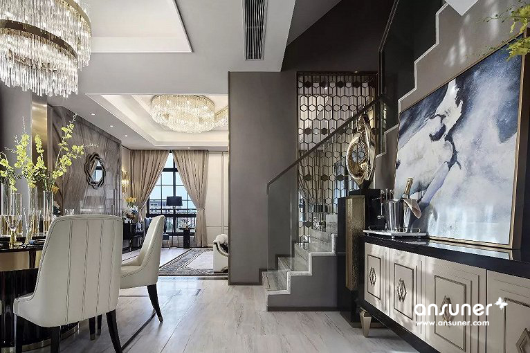 设计师认为“大都会风格适合的是永远追求精致生活的人群,希望空间在彰显时代气脉的同时,突出时尚气质、高端凝整的观感以及与众不同的品味。而中交锦悦恰好满足了这类人群的心理诉求,拥有现代的浪漫尊贵,又不失内敛稳重,美沉浸在华贵的细节,散发出瑰丽、沁雅的城市香气。”