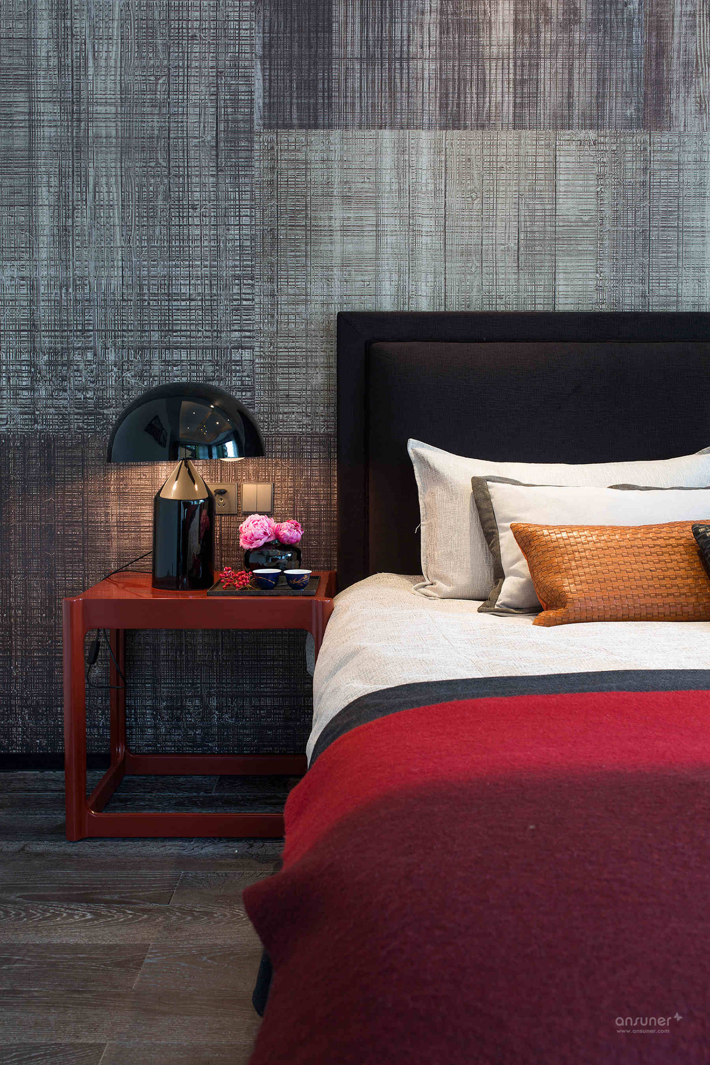 主卧:主卧设计将粗麻原始的肌理感运用到极致,以呈现安稳的时光。床头的背景墙带有棉麻布的纹路和质感,相同色系的深浅调和,又赋予空间丰富的层次美感。正红色的上漆床头柜,点燃中国风的明艳魅力。