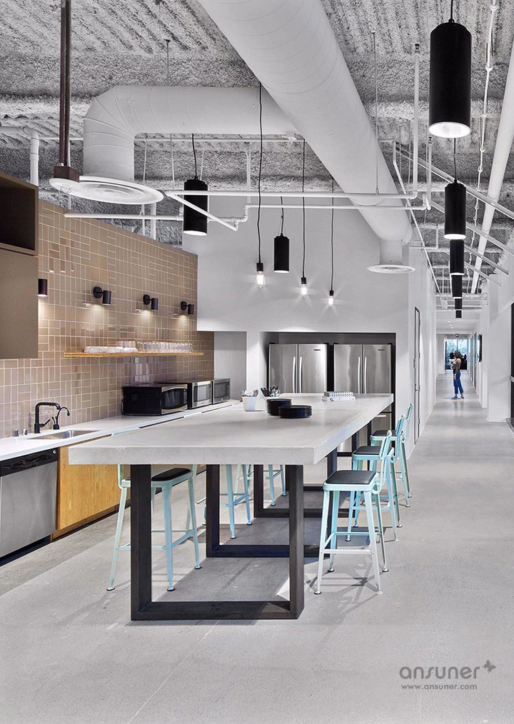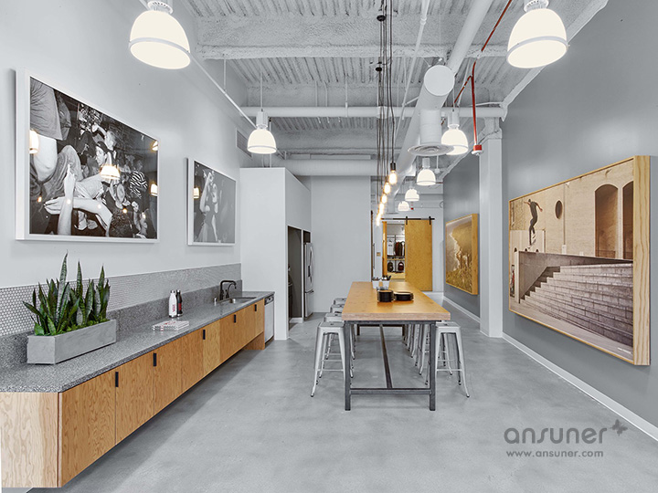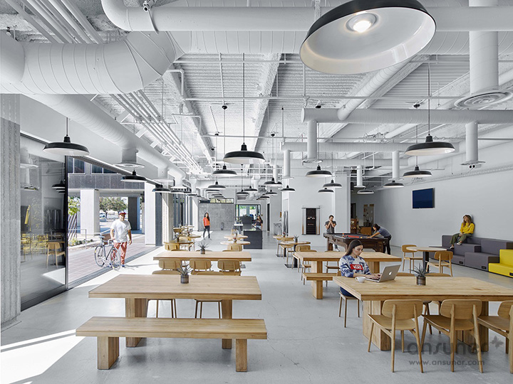 室内特别设计成混凝土水泥地面,鼓励大家踩着滑板在工作区之间自由穿梭。以开放式协作型设计理念塑造的工作环境,培养和促进积极的工作方式、以及协作和创新的工作文化。