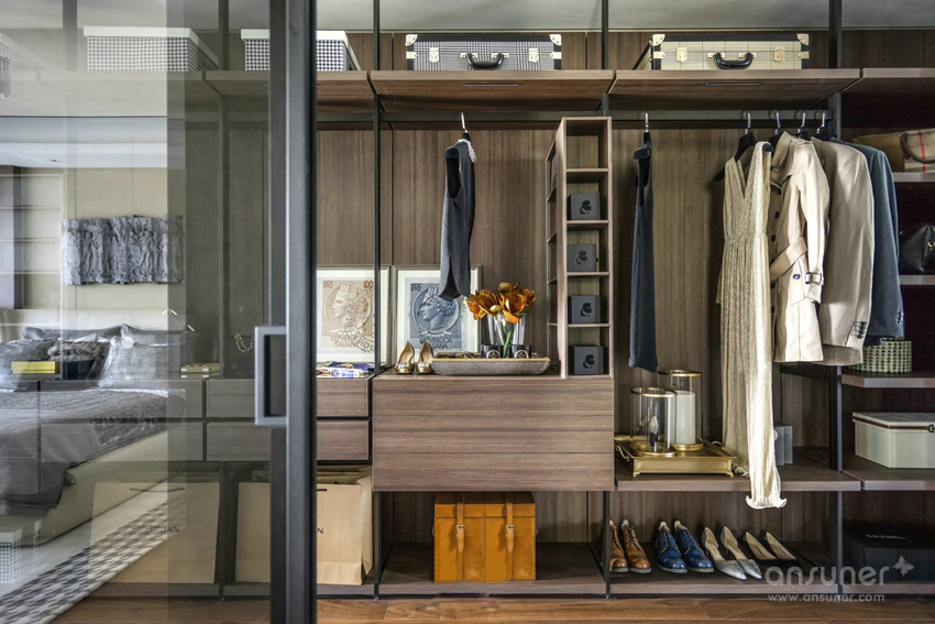 设计师利用对色彩的敏锐视角,以做旧的古罗马灰为主色调表达了主卧空间的优雅和感性,独具风情的格纹地毯,工艺精细的斗柜,艺术装饰画和精心布置的装饰品,让空间有着不同韵律的过渡。