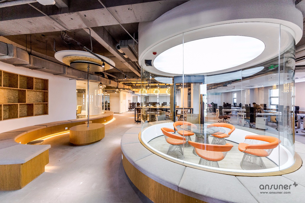 圆弧形的会议室和休闲区是本次设计的核心,也是凸显共享和交融的重点,通透的玻璃会议室和无遮拦的休闲区设计形成完美的结合。休闲区的设计得益于当今的科技发展,移动式办公成为可能。标注办公桌渐渐转化为共享办公桌,多元化的移动办公方式提供了更丰富的选择。个人固定办公桌时代已经成为过去,员工要考虑的事情就是选择哪里更合适今天的心情、今天的工作。