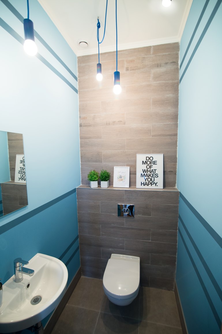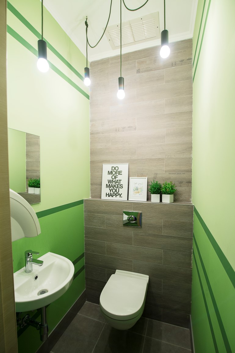 三个洗手间分别设计成三种主题色彩,并以各自的色彩灯具来搭配。小小的空间却处处彰显着精致与创意。