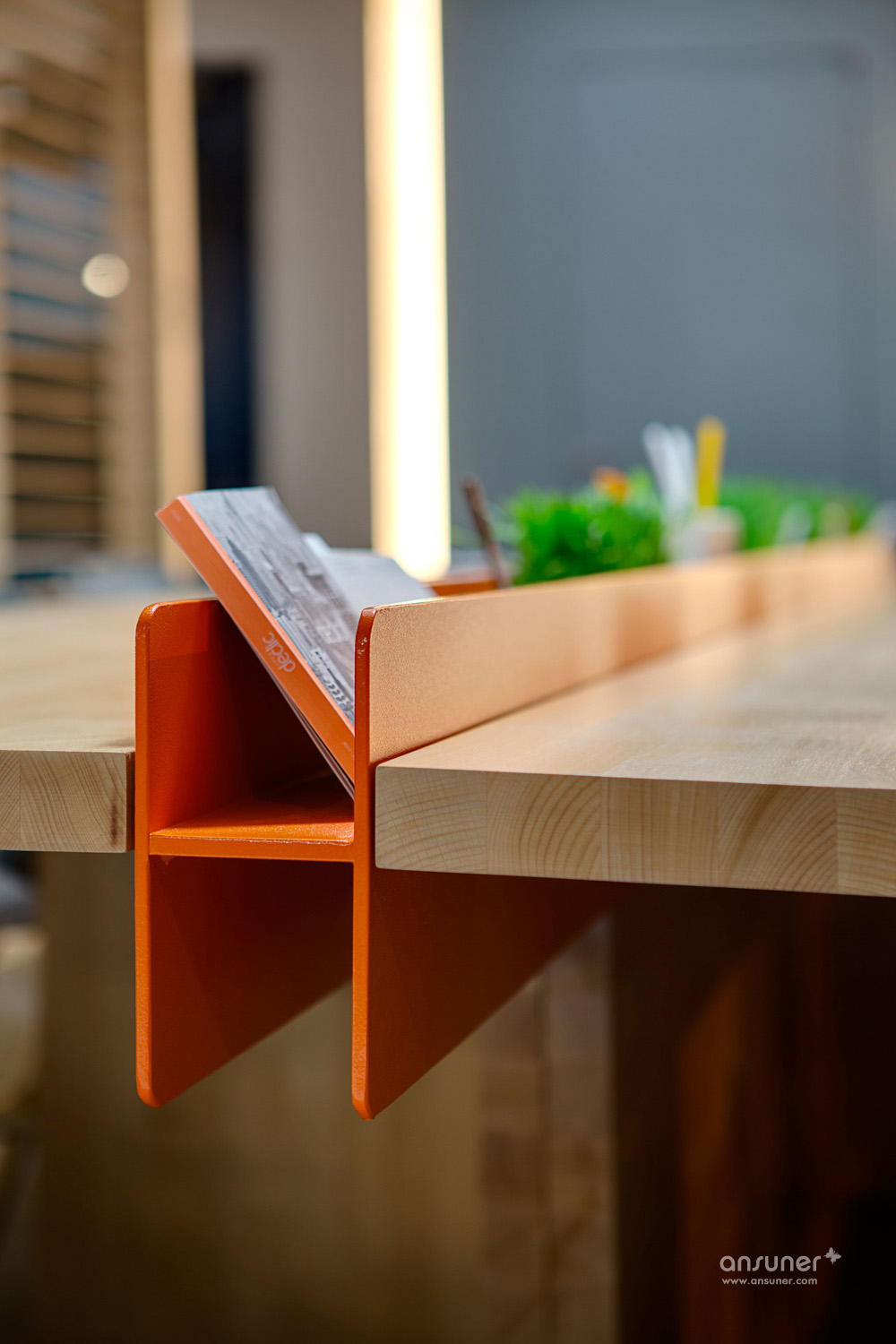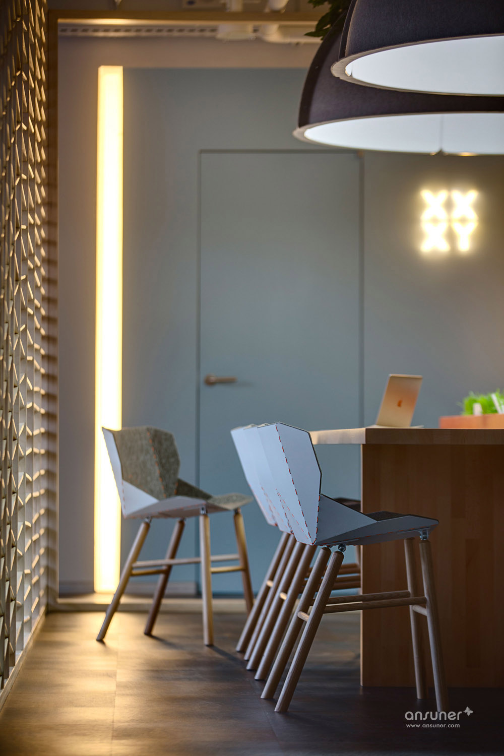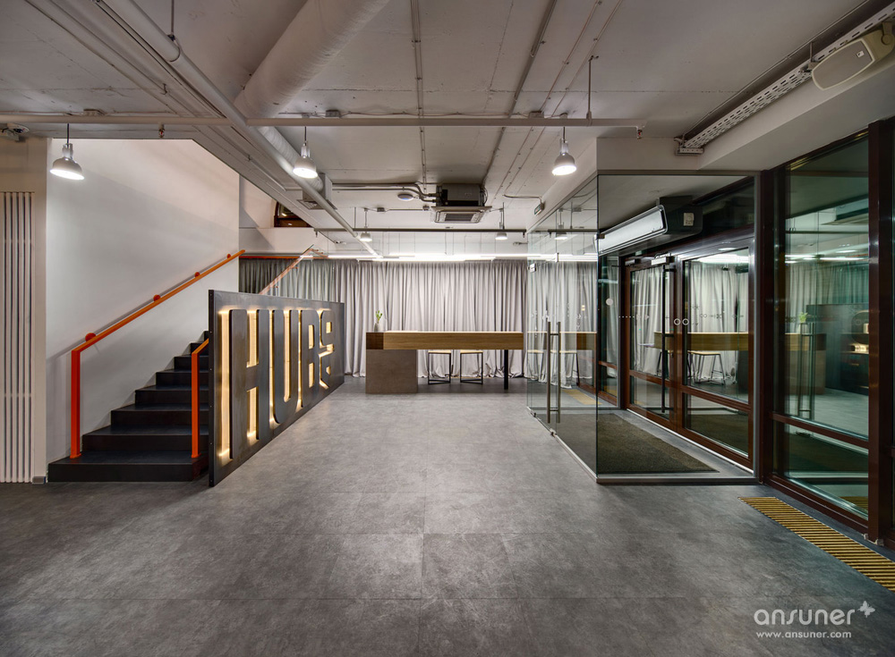 在一层的大厅,一幅热熔金属打造的“HUB 4.0”LOGO装饰板醒目的矗立眼前,其后的楼梯采用清透的玻璃护栏。动感明亮的灯光勾勒出长形的接待台。胶合板制作的创意隔墙界定了工作空间。