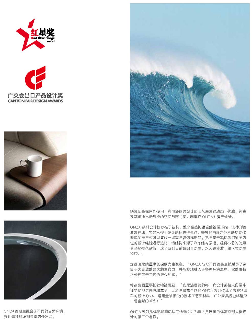 设计灵感:动感的海浪 “奢华”---奢华原创独一无二 “革新”---6mm铝板整体成型和无缝焊接+TIGER牌喷粉+纯天然A级缅甸柚木,搭配顶级环保用材,技术革新 “优美”---游艇SUNBRELLA 布艺,超厚快干棉异形切割,体现完美形态,满足全天候的户外条件 “多变”---30多种搭配组合,精选3种主流颜色,室内室外搭配随心所欲 “细致” ---防水布罩,多功能卡扣,防霉里布,蜂窝纸箱,细致入微,解决您的后顾之忧